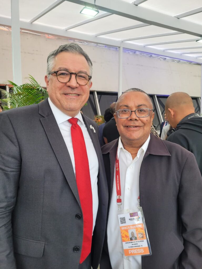 Na foto, Alexandre Padilha aparece ao lado do jornalista Carlos Magno, de Canaã dos Carajás (PA), durante a reunião da Cúpula do BRICS, realizada em julho passado no Museu de Arte Moderna (MAM), no Rio de Janeiro.