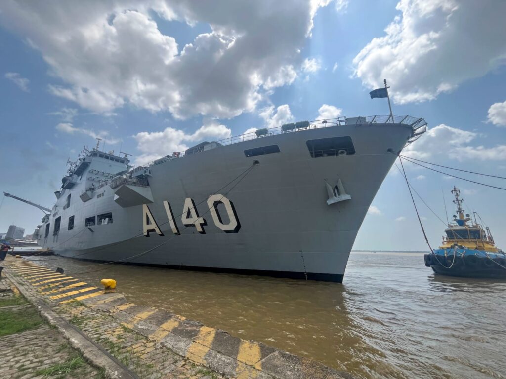 O Navio-Aeródromo Multipropósito (NAM) “Atlântico”, maior navio de guerra da América Latina e atual capitânia da Marinha do Brasil, está atracado no Porto de Belém para apoiar as operações de segurança da COP30. Neste domingo (9), a imponente embarcação reabriu para visitação pública, atraindo centenas de pessoas ao cais da Companhia Docas do Pará (CDP).